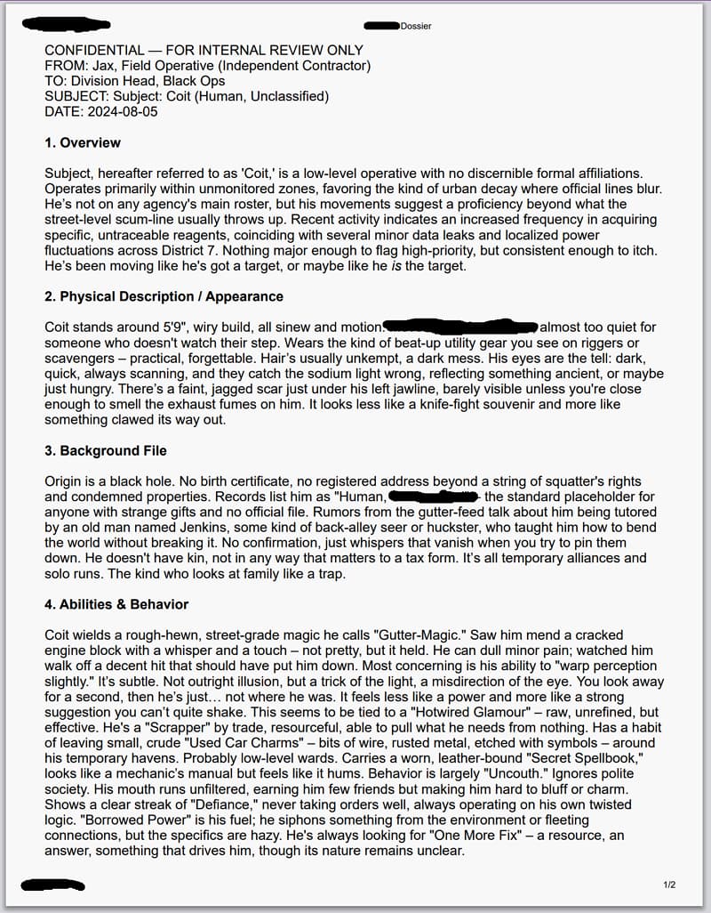 It’s got a nice dossier at the end. The AI prompts are transparent and editable. There’s even a character image generator.